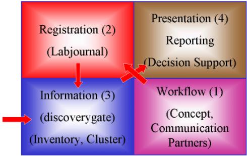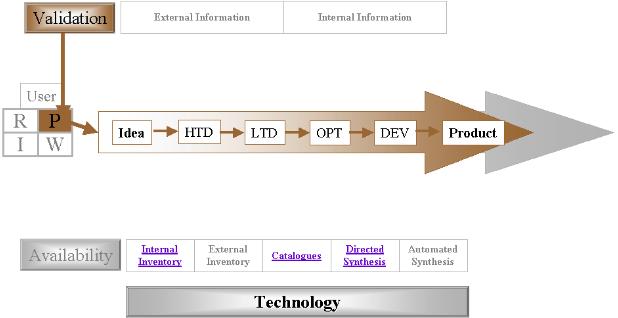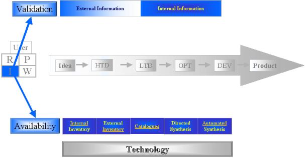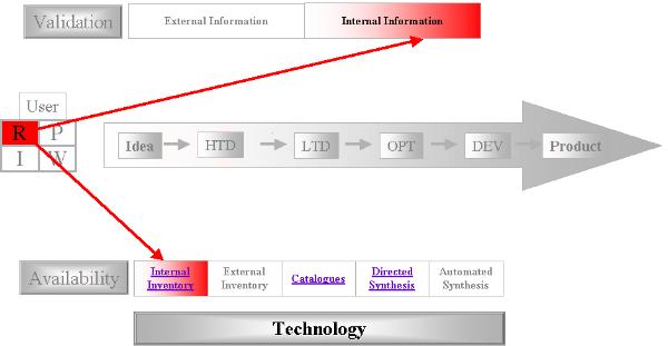 The pictures below show very a schematic research process, the big arrow in the middle represents the different tasks, often in parallel that need to be done to drive compound to become a drug. Above and below are the two major task that confront the scientist after he has chosen his idea what to do. He needs chemicals to prove his idea, and internal and external information to verify his idea.